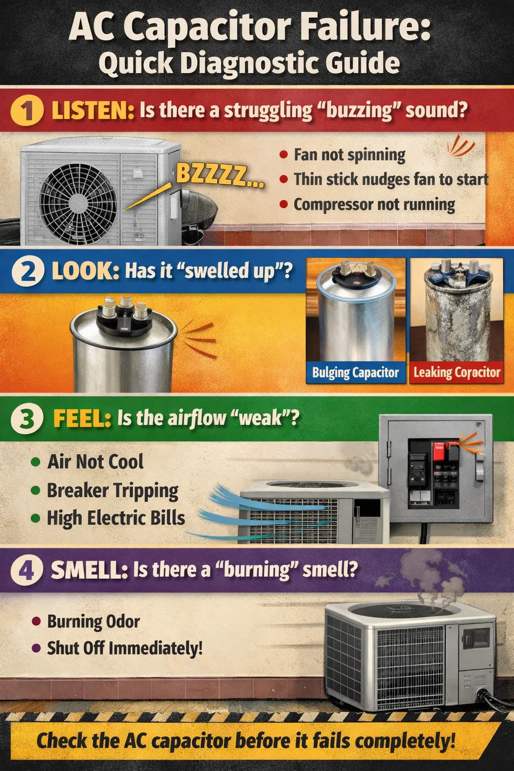 هنگامی که کولر گازی شما شروع به کار می کند، خازن AC اغلب آسانترین بخش شکست و همچنین آسانترین بخش برای تشخیص است. شما نیازی به جداسازی مدارهای پیچیده ندارید. تقریباً می توانید با استفاده از این روش های ساده تعیین کنید که آیا نیاز به تعویض دارد: