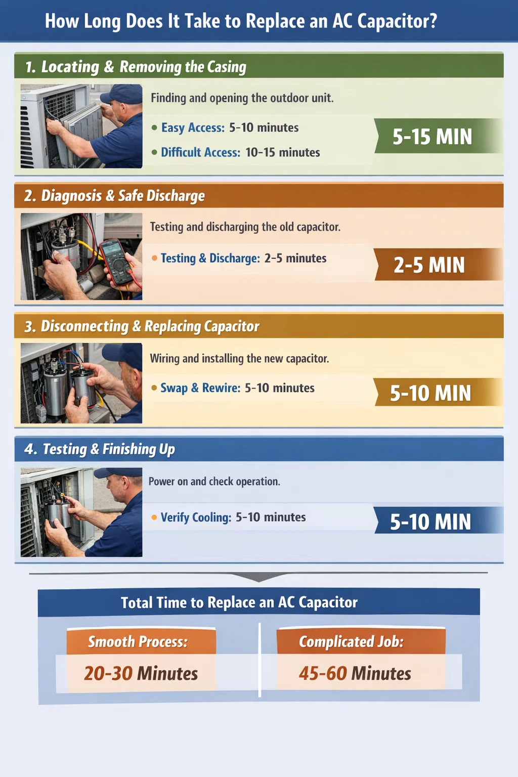 در واقع چقدر طول می کشد تا جایگزین شود خازن AC ? اگر فقط چند دقیقه ای را که تکنسین کار می کند تماشا کنید، ممکن است فکر کنید کار به طرز شگفت آوری سریع است. اما از لحظه ای که تکنسین وارد می شود تا زمانی که کولر گازی دوباره هوای سرد را می دمد، یک فرآیند کامل درگیر است.