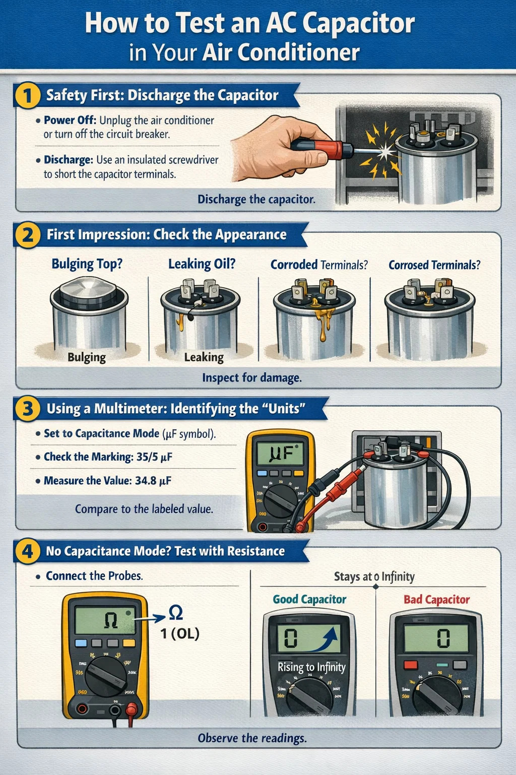 تعیین خوب یا بد بودن خازن AC در یک تهویه مطبوع نیازی به دانش حرفه ای مهندسی الکترونیک ندارد. تا زمانی که یک مولتی متر با عملکرد "تست ظرفیت" دارید، می توانید این مراحل را دنبال کنید و خودتان یک نیمه متخصص شوید.