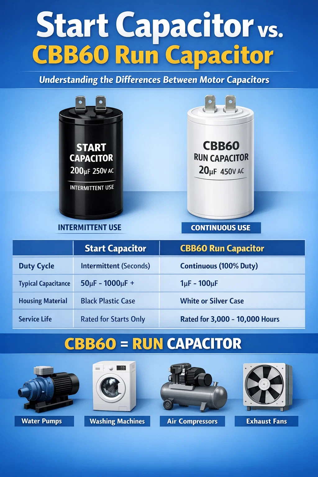 تفاوت های عملکردی: خازن شروع در مقابل خازن کارکرد CBB60