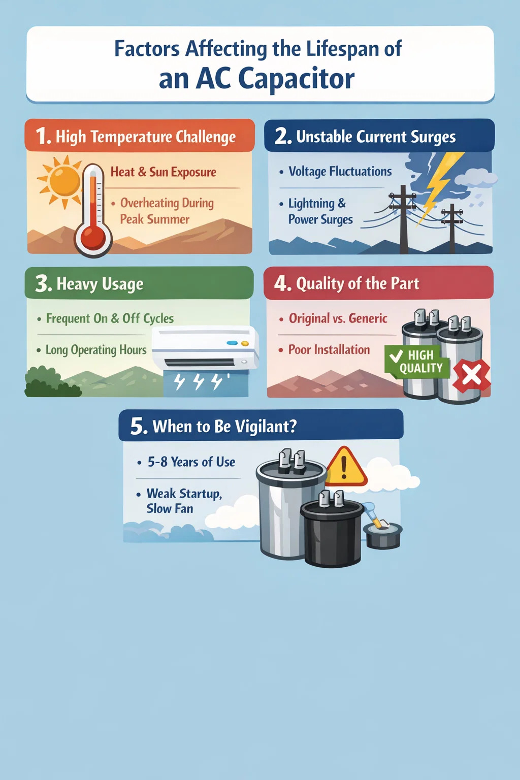 تعداد راه اندازی: خازن در هنگام راه اندازی به سختی کار می کند. اگر مرتباً کولر گازی را روشن و خاموش می کنید، یا اگر ترموستات به درستی تنظیم نشده باشد و باعث روشن و خاموش شدن مکرر کمپرسور شود، خازن AC خیلی سریع فرسوده می شود.