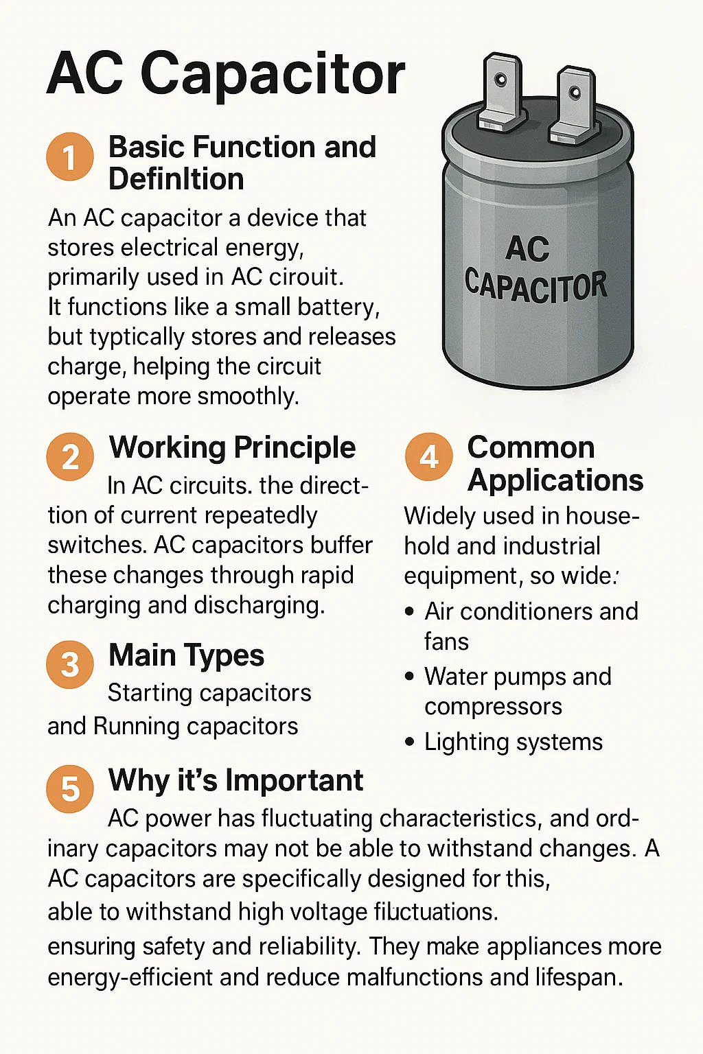 خازن AC وسیله ای است که انرژی الکتریکی را ذخیره می کند که عمدتاً در مدارهای AC استفاده می شود. مانند یک باتری کوچک عمل می کند، اما متفاوت عمل می کند—الکتریسیته تولید نمی کند. در عوض، به طور موقت شارژ را ذخیره و آزاد می کند و به مدار کمک می کند تا نرم تر عمل کند. در حالی که خازن های معمولی ممکن است در دستگاه های DC استفاده شوند، خازن های AC به طور خاص برای ویژگی های برق AC طراحی شده اند، زیرا جهت و مقدار جریان AC دائما تغییر می کند.